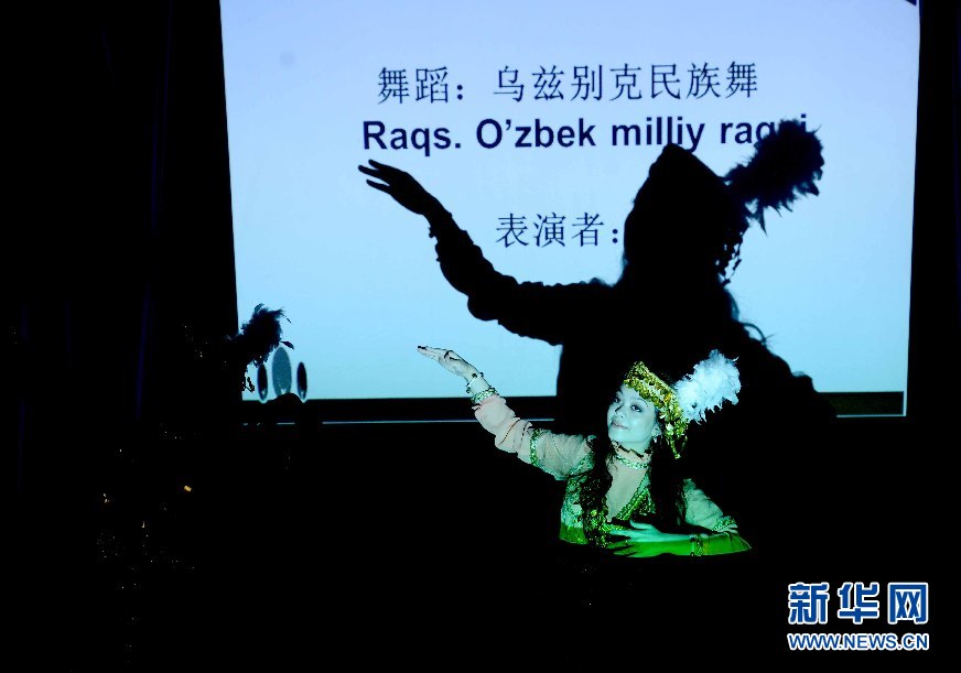 6月9日,學(xué)生代表在烏茲別克斯坦首都塔什干的烏世界語(yǔ)言大學(xué)禮堂表演節(jié)目。