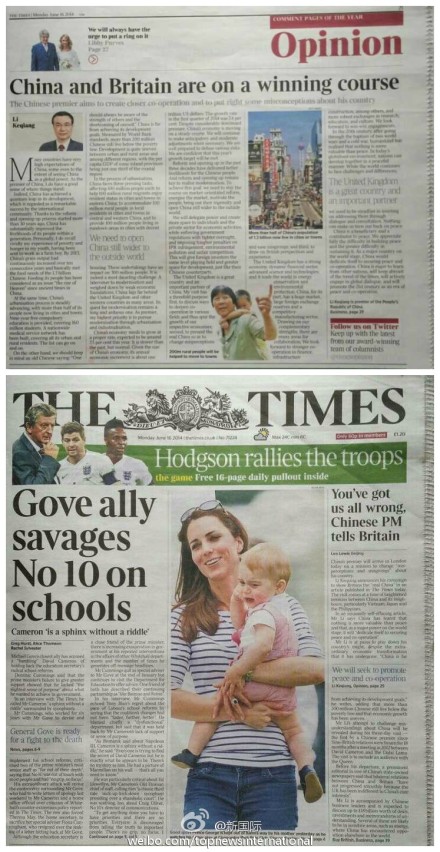 ????新華網(wǎng)北京6月17日電 據(jù)新華社“新國際”微博報道,訪英前夕,李克強總理16日在英國主流媒體《泰晤士報》發(fā)表題為“中英正走在共贏的道路上”的署名文章。對此,該報同日在頭版配發(fā)文章稱,李克強的文章標(biāo)志著一場“展示真正中國的運動”已開始,中國作為世界重要國家,將為維護和平與合作作出積極貢獻。?