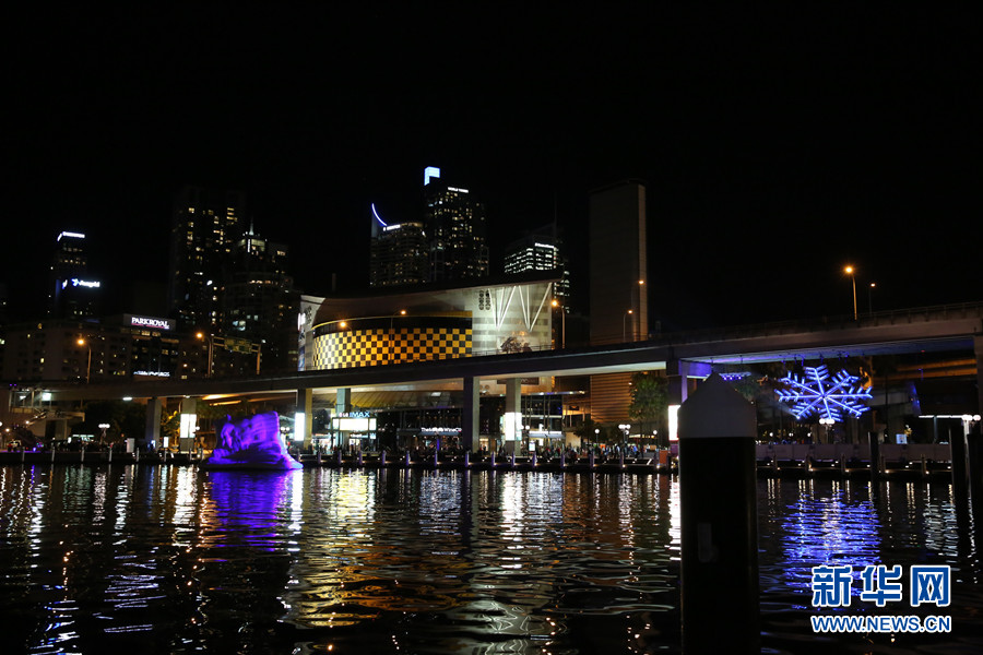 ????6月13日起,為期1個月的大型冬季冰雪活動在悉尼市中心的情人港(Darling Harbour)為悉尼市民冬季的生活增添了些許名副其實的冬季氣氛。圖為悉尼情人港被雪白的冰山和雪花裝點,在夜晚燈光的點綴下生動熠熠。新華社記者 李冰 攝