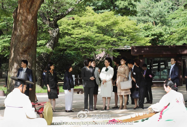 ???? 新華網(wǎng)北京7月3日電? 據(jù)新華社“新國際”微博報道,習近平主席夫人彭麗媛3日下午在韓國官員陪同下參觀被列為世界文化遺產的昌德宮,了解宮殿建筑歷史、音樂傳承等情況,并欣賞韓國傳統(tǒng)樂器伽倻琴散調表演,對藝術家的精彩演出表示高度贊賞。彭麗媛說,中韓友誼源遠流長,歡迎韓國朋友多到中國參觀訪問。