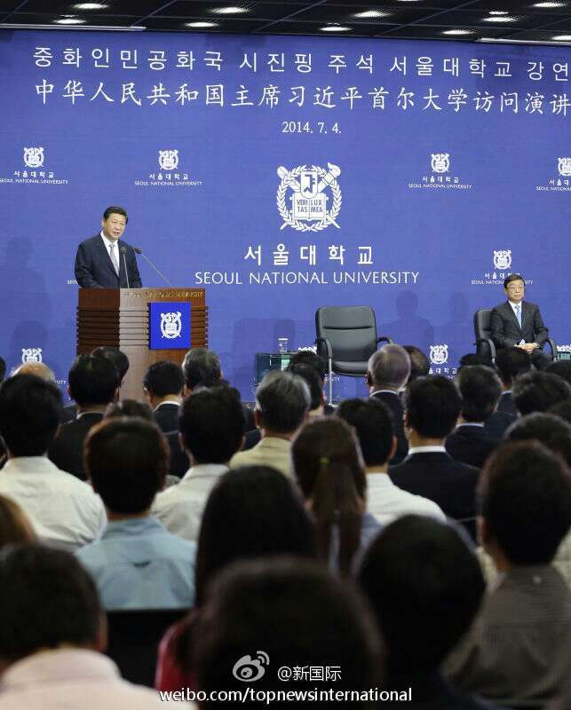 ??? 新華網(wǎng)北京7月4日電 據(jù)新華社“新國(guó)際”微博報(bào)道,首爾大學(xué)的大講堂座無(wú)虛席,傾聽中國(guó),感受中韓夢(mèng)想的交匯。習(xí)主席說(shuō),要有海納百川的胸懷,以開放包容心態(tài)虛心傾聽世界的聲音。中國(guó)將繼續(xù)向世界學(xué)習(xí)、向各國(guó)人民學(xué)習(xí),學(xué)習(xí)人類創(chuàng)造的一切文明成果,推動(dòng)中國(guó)和世界發(fā)展得更好。?