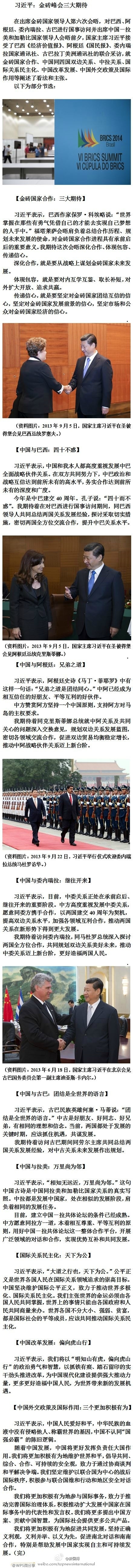 ???? 新華網(wǎng)北京7月15日電 據(jù)新華社“新國(guó)際”微博報(bào)道,在出席金磚國(guó)家領(lǐng)導(dǎo)人第六次會(huì)晤,對(duì)巴西、阿根廷、委內(nèi)瑞拉、古巴進(jìn)行國(guó)事訪問并出席中國(guó)-拉美和加勒比國(guó)家領(lǐng)導(dǎo)人會(huì)晤前夕,國(guó)家主席習(xí)近平接受了巴西《經(jīng)濟(jì)價(jià)值報(bào)》、阿根廷《國(guó)民報(bào)》、委內(nèi)瑞拉國(guó)家通訊社、古巴拉丁美洲通訊社的聯(lián)合采訪。精彩內(nèi)容請(qǐng)點(diǎn)長(zhǎng)微博。?