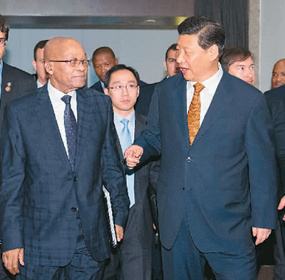 習(xí)近平表示,當(dāng)前,中南關(guān)系正面臨重要發(fā)展機(jī)遇期,合作潛力巨大,我們應(yīng)該乘勢而上,努力推動中南關(guān)系再上新臺階。我歡迎祖馬總統(tǒng)下半年訪華,共同制定未來合作規(guī)劃。雙方要積極開展能源、礦業(yè)、農(nóng)業(yè)、裝備制造、基礎(chǔ)設(shè)施建設(shè)、鐵路機(jī)車、核電等領(lǐng)域合作,中方愿繼續(xù)配合南非辦好2014年中國南非年活動。
