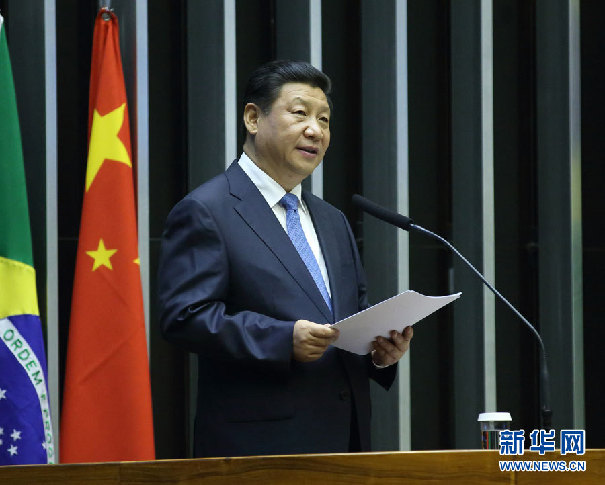 ??? 7月16日,國(guó)家主席習(xí)近平在巴西國(guó)會(huì)發(fā)表《弘揚(yáng)傳統(tǒng)友好共譜合作新篇》的演講。 新華社記者蘭紅光攝