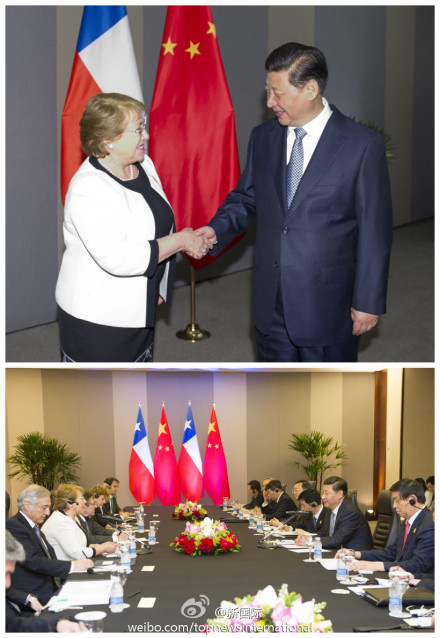 ??? 新華網(wǎng)北京7月17日電 據(jù)新華社“新國(guó)際”微博報(bào)道,習(xí)近平主席16日在會(huì)見(jiàn)智利總統(tǒng)巴切萊特時(shí)說(shuō),新形勢(shì)下,中智雙方要深挖雙邊貿(mào)易增長(zhǎng)潛力,不斷加強(qiáng)重點(diǎn)領(lǐng)域投資合作,同時(shí)深化金融合作,形成以金融為引擎,貿(mào)易和投資兩個(gè)輪子一起轉(zhuǎn)的中智務(wù)實(shí)合作格局。(攝影:王曄、謝環(huán)馳)?