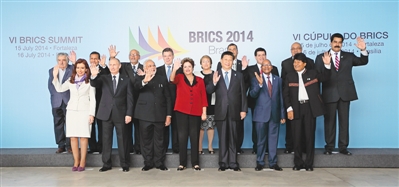 本報(bào)巴西利亞7月16日電?。ㄓ浾叨派袧?、丁剛)7月16日,金磚國(guó)家同南美國(guó)家領(lǐng)導(dǎo)人對(duì)話會(huì)在巴西利亞舉行。中國(guó)國(guó)家主席習(xí)近平、巴西總統(tǒng)羅塞夫、俄羅斯總統(tǒng)普京、印度總理莫迪、南非總統(tǒng)祖馬以及蘇里南總統(tǒng)鮑特塞、阿根廷總統(tǒng)克里斯蒂娜、玻利維亞總統(tǒng)莫拉萊斯、哥倫比亞總統(tǒng)桑托斯、智利總統(tǒng)巴切萊特、厄瓜多爾總統(tǒng)科雷亞、圭亞那總統(tǒng)拉莫塔爾、巴拉圭總統(tǒng)卡特斯、秘魯總統(tǒng)烏馬拉、烏拉圭總統(tǒng)穆??ā⑽瘍?nèi)瑞拉總統(tǒng)馬杜羅等南美國(guó)家領(lǐng)導(dǎo)人共同出席。