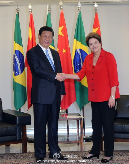 ??? 據(jù)新華社“新國際”微博報道,習(xí)近平17日與巴西總統(tǒng)羅塞夫會談時表示,中巴政治和戰(zhàn)略互信達(dá)到前所未有的高水平,利益聯(lián)系達(dá)到前所未有的緊密程度,兩國已經(jīng)成為命運共同體。雙方應(yīng)該加強交流合作,共同維護發(fā)展中國家共同利益,推動國際力量對比朝著更加均衡方向發(fā)展。(蘭紅光攝)