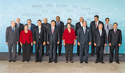 ? 當(dāng)?shù)貢r(shí)間7月17日下午,中國(guó)—拉美和加勒比國(guó)家領(lǐng)導(dǎo)人會(huì)晤在巴西利亞舉行。本次會(huì)晤由中方倡議,中國(guó)國(guó)家主席習(xí)近平、巴西總統(tǒng)羅塞夫、哥斯達(dá)黎加總統(tǒng)索利斯、古巴國(guó)務(wù)委員會(huì)主席兼部長(zhǎng)會(huì)議主席勞爾·卡斯特羅、厄瓜多爾總統(tǒng)科雷亞、蘇里南總統(tǒng)鮑特塞、哥倫比亞總統(tǒng)桑托斯、智利總統(tǒng)巴切萊特、圭亞那總統(tǒng)拉莫塔爾、烏拉圭總統(tǒng)穆??ā⑽瘍?nèi)瑞拉總統(tǒng)馬杜羅、安提瓜和巴布達(dá)總理布朗等出席。