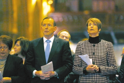 19日,澳總理及妻子在悉尼參加馬航墜機(jī)澳大利亞遇難者悼念儀式。圖/CFP