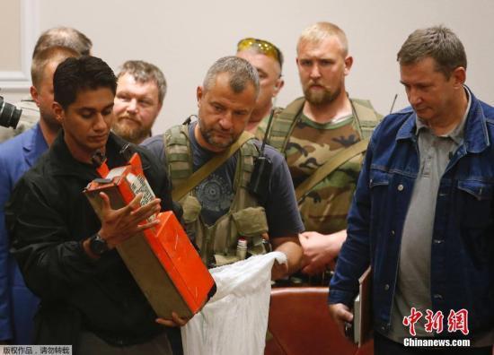 當(dāng)?shù)貢r(shí)間2014年7月22日,頓涅茨克,“頓涅茨克人民共和國(guó)”官員向馬來(lái)西亞調(diào)查人員移交馬航MH17航班客機(jī)黑匣子。