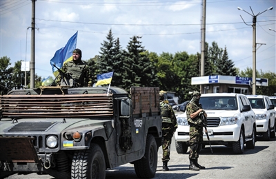 7月31日,烏克蘭政府軍車護(hù)送專家組車隊進(jìn)入墜機(jī)現(xiàn)場。