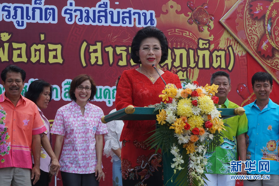 ????8月12日,泰國普吉府舉辦中國傳統(tǒng)的“中元普渡”活動,以普渡孤魂,表達仁愛和孝道思想。該活動在普吉已有150多年的歷史,每逢中國農(nóng)歷7月,當?shù)厝A人便會舉行祭祀儀式,用面粉和糖制成大小不一的紅色面團,裝飾成烏龜形狀,既表達了對于祖先的懷念,還傳遞了對于全家人健康長壽的祝福。圖為普吉府普吉市市長頌齋(中)在活動開幕式上。新華網(wǎng)記者 楊云燕 攝