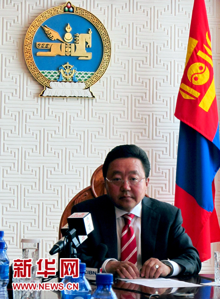 ??? 8月15日,蒙古國總統(tǒng)額勒貝格道爾吉在烏蘭巴托接受中國新聞代表團的聯(lián)合采訪。新華社記者馮堅攝