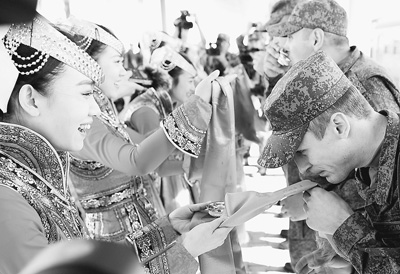 2014年8月16日,在內(nèi)蒙古自治區(qū)朱日和訓練基地火車站,來自俄羅斯的參演實兵部隊官兵在歡迎儀式上接受蒙古族傳統(tǒng)迎賓禮。
