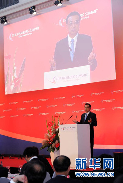 ??? 當(dāng)?shù)貢r(shí)間10月11日中午,國(guó)務(wù)院總理李克強(qiáng)在漢堡出席中歐論壇漢堡峰會(huì)第六屆會(huì)議并發(fā)表題為《樹(shù)立互利共贏的新標(biāo)桿》的主旨演講。新華社記者 饒愛(ài)民 攝