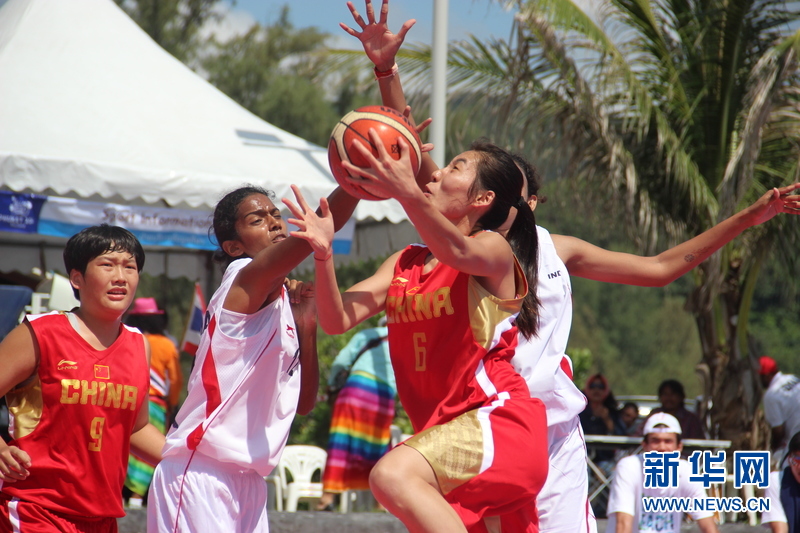 ??? 11月16日,中國沙灘籃球運(yùn)動員房玲玲(左三)與安靜(左一)在比賽中。中國體育代表團(tuán)16日在泰國普吉舉行的第四屆亞洲沙灘運(yùn)動會上勇奪2枚金牌和2枚銅牌。當(dāng)天比賽全部結(jié)束時,中國隊以3金2銀5銅的成績暫列獎牌榜第五。新華社發(fā)(塔納攝)