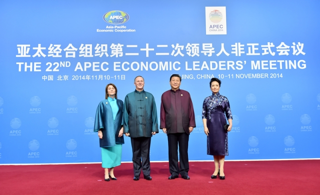 ??? (2014年11月10日,國(guó)家主席習(xí)近平和夫人彭麗媛迎候新西蘭總理約翰·基夫婦。新華社記者李濤攝)