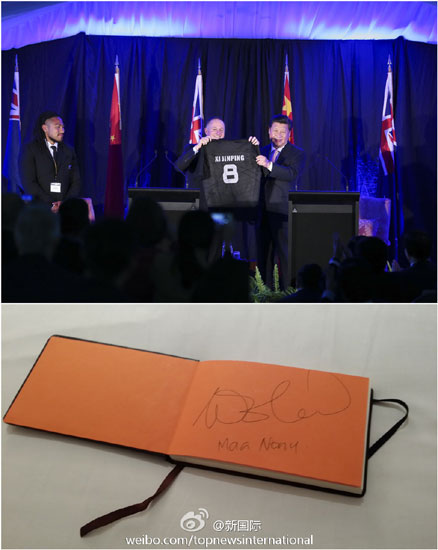 ??? 新華網(wǎng)北京11月20日電? 據(jù)新華社“新國際”微博報道,中新兩國領(lǐng)導人20日共見記者后,新西蘭英式橄欖球球星Ma'a Nonu贈送習主席一件球衣。習主席高興地說,歡迎你到中國交流、教學、比賽,推動英式橄欖球在中國的發(fā)展。Nonu興奮地說:“我現(xiàn)在就可以去!”