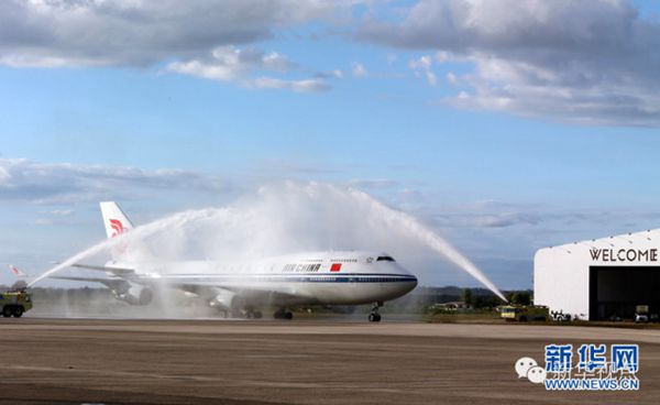 ???? ?11月21日,國家主席習(xí)近平抵達(dá)楠迪,開始對斐濟(jì)進(jìn)行國事訪問并將同太平洋建交島國領(lǐng)導(dǎo)人舉行會晤。圖為習(xí)近平乘坐的專機(jī)在楠迪國際機(jī)場跑道上滑行穿過“水門”,這是當(dāng)?shù)亟o予最尊貴客人的禮遇,表達(dá)為客人“洗塵”。 新華社記者 丁林 攝