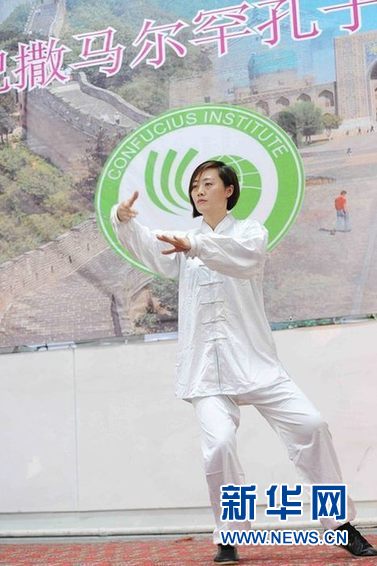 ????11月27日,烏茲別克斯坦撒馬爾罕國立外國語學(xué)院禮堂,上海外國語大學(xué)李海榮老師在表演太極拳。(新華網(wǎng)記者 沙達(dá)提 攝)