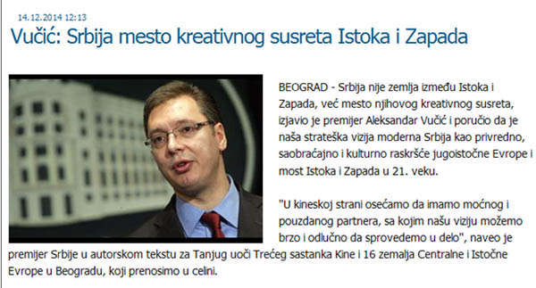 塞爾維亞總理武契奇14日在塞爾維亞南通社發(fā)表題為《塞爾維亞是東西方創(chuàng)造性相遇的地方》的署名文章。文章稱,塞爾維亞不是夾在東西方之間的國家,而是東西方創(chuàng)造性相遇的地方。他表示,一個現(xiàn)代化的塞爾維亞(應)成為東部歐洲經(jīng)濟、交通、文化的交叉點以及21世紀東西方的橋梁。他說,中國是強大的和值得信賴的伙伴,通過同中國的合作,塞爾維亞可以很快、堅定地去實施自己的戰(zhàn)略預想。武契奇還引用《孫子兵法》作者孫武的話“如果你善于利用機會,機會會增加”,表示賽爾維亞將緊緊抓住現(xiàn)在的機遇,為自己的發(fā)展創(chuàng)造新的機會。