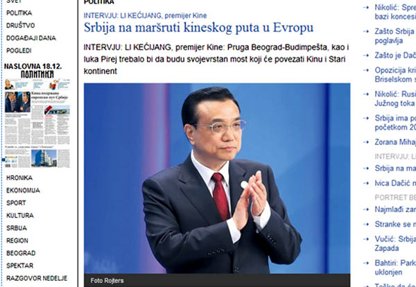 此外,塞爾維亞《政治報》網(wǎng)站刊文《中塞關(guān)系就像高速列車》,透露李克強和武契奇總理將共同為由中國專家建設(shè)的跨多瑙河大橋通車剪彩,并有望商談新的基建項目。塞爾維亞國家廣播電視臺RTS刊文《貝爾格萊德峰會,加強經(jīng)濟關(guān)系》稱,近三十年時間里,中國總理將首訪塞爾維亞,中塞兩國總理將共同成為中國-中東歐國家領(lǐng)導人會晤的東道主。新的絲綢之路設(shè)想是為了加強中亞各國的聯(lián)系,而這條路也把中國帶到了巴爾干半島。