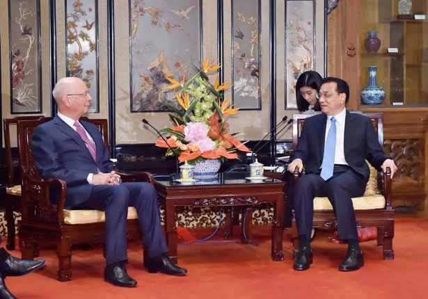 (2014年5月28日,國(guó)務(wù)院總理李克強(qiáng)在北京釣魚(yú)臺(tái)國(guó)賓館會(huì)見(jiàn)世界經(jīng)濟(jì)論壇主席施瓦布。新華社記者李濤攝)