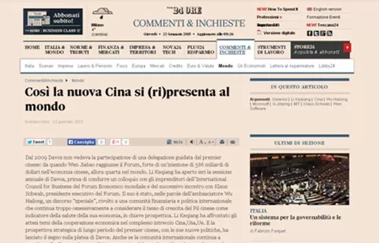 意大利24小時(shí)太陽(yáng)報(bào)1月22日發(fā)表題為《中國(guó)重新向世界自我介紹》的評(píng)論性文章,介紹了李克強(qiáng)在世界經(jīng)濟(jì)論壇上的講話。文章稱(chēng),雖然國(guó)際社會(huì)一直在用西方國(guó)家的種族主義中心心態(tài)以及舊的眼光看待中國(guó),中國(guó)國(guó)務(wù)院總理李克強(qiáng)的長(zhǎng)期戰(zhàn)略眼光和他的新政策還是給達(dá)沃斯的聽(tīng)眾們留下深刻印象。
