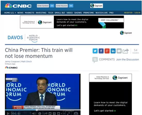 華爾街日?qǐng)?bào)、彭博新聞社、金融時(shí)報(bào)、CNBC和美聯(lián)通訊社等美國(guó)主流媒體,都報(bào)道了李克強(qiáng)總理在達(dá)沃斯論壇上有關(guān)中國(guó)將避免經(jīng)濟(jì)硬著陸,以及確保在中長(zhǎng)期經(jīng)濟(jì)有所增長(zhǎng)的講話。