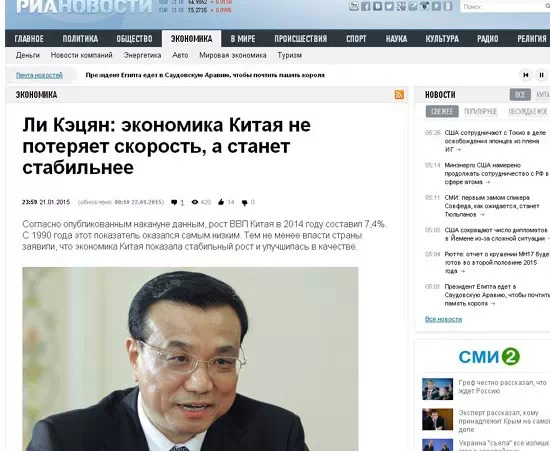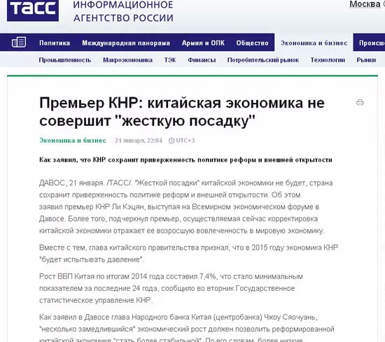 塔斯社發(fā)表了一篇名為《中國(guó)總理:中國(guó)經(jīng)濟(jì)不會(huì)硬著陸》的文章。文中指出,李克強(qiáng)和中國(guó)央行行長(zhǎng)周小川在達(dá)沃斯論壇期間均表示,中國(guó)將深化改革開(kāi)放,漸緩的增長(zhǎng)速度有利于中國(guó)經(jīng)濟(jì)的轉(zhuǎn)型。在3月份舉行的中國(guó)兩會(huì)上,中國(guó)政府將提出新的經(jīng)濟(jì)發(fā)展規(guī)劃,速度肯定不會(huì)是北京追求的首要目標(biāo)。