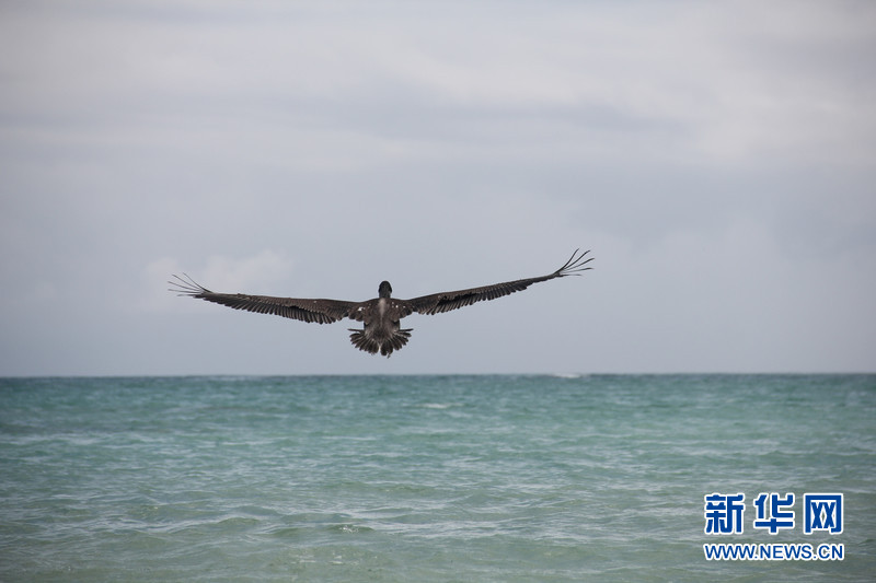 鵜鶘飛行在加拉帕戈斯群島中部的圣克魯斯島。