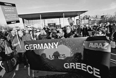 為彌合在希臘債務(wù)問題上的分歧,德國總理默克爾3月23日在柏林與到訪的希臘總理齊普拉斯會談。圖為當(dāng)天在德國柏林,有示威者打出“德國愛希臘”的標語,呼吁雙方盡快達成共識。人民視覺