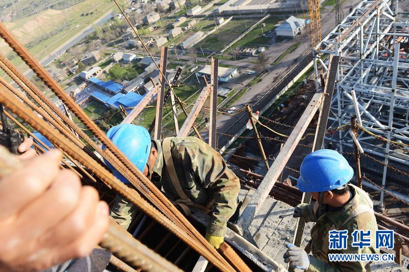 ????烏茲別克斯坦安格連(市)電廠煙囪施工現(xiàn)場,來自中國能建集團黑龍江省火電第一工程有限公司的工人在作業(yè)。新華網(wǎng)發(fā) 記者沙達提 攝