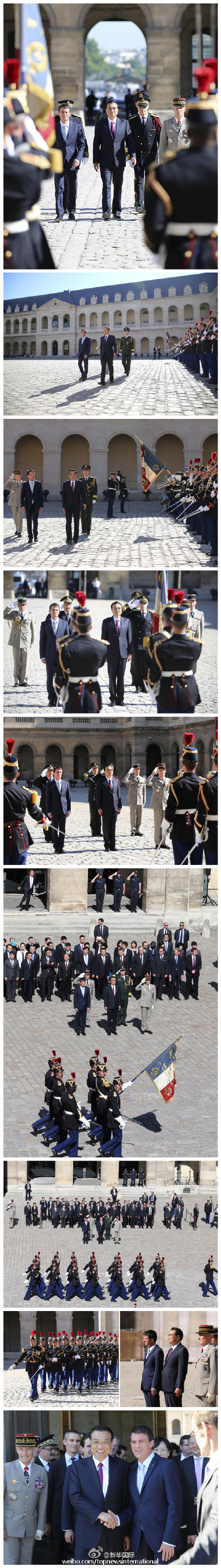 新華網(wǎng)北京7月1日電 據(jù)新華社“新華國際”微博報(bào)道,當(dāng)?shù)貢r(shí)間30日上午,法國總理瓦爾斯在榮軍院舉行隆重儀式,歡迎李克強(qiáng)總理訪法。明媚的陽光下,50人方陣的軍樂隊(duì)高奏中法兩國國歌,雄壯的《義勇軍進(jìn)行曲》和激昂的《馬賽曲》響徹榮軍院上空。隨后,儀仗隊(duì)舉行分列式,接受中國總理李克強(qiáng)的檢閱。