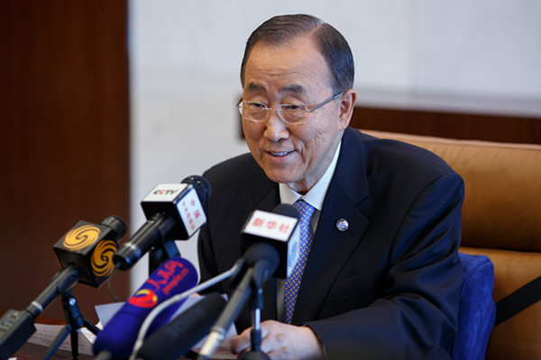 2015年8月28日,在紐約聯(lián)合國總部,聯(lián)合國秘書長潘基文接受中國媒體聯(lián)合采訪。(新華社記者 李木子 攝)