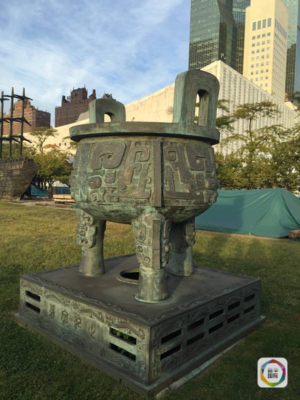 1995年10月,為紀念聯(lián)合國成立50周年,中國向聯(lián)合國紐約總部贈送了一座重約1.5噸的“世紀寶鼎”。這座鼎目前安放在聯(lián)合國大樓北花園的草坪上,鼎座高0.5米,象征聯(lián)合國成立50周年;鼎身高2.1米,象征21世紀;底座上飾56條夔龍,象征56個民族都是龍的傳人。