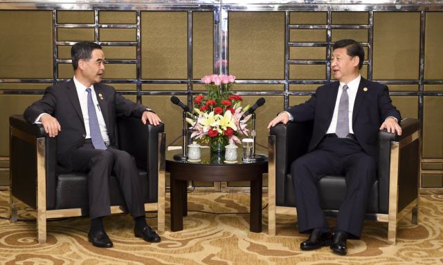 11月18日,國家主席習(xí)近平在菲律賓馬尼拉會(huì)見前來出席亞太經(jīng)合組織第二十三次領(lǐng)導(dǎo)人非正式會(huì)議的香港特別行政區(qū)行政長官梁振英。(新華社記者謝環(huán)馳攝)