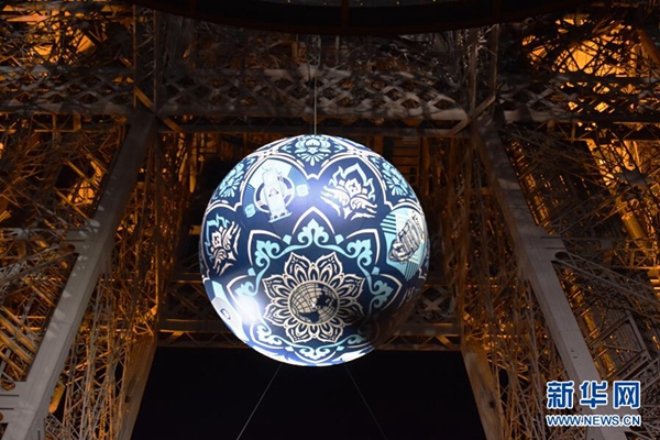 11月23日,在法國巴黎,一個名為“地球危機(jī)”的大圓球懸掛在埃菲爾鐵塔上。