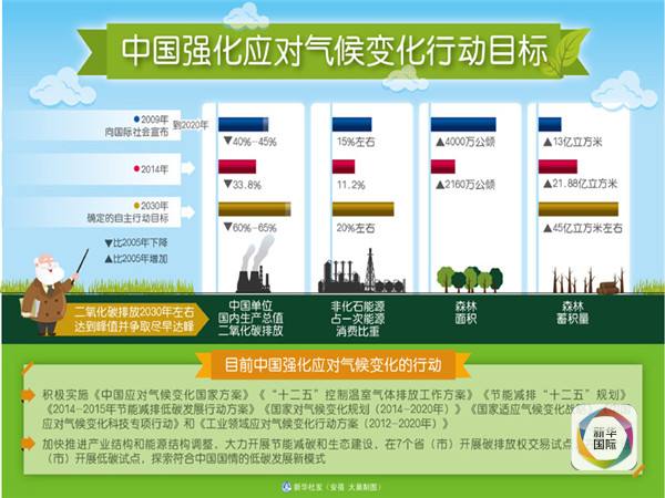 今年6月,中國正式向聯(lián)合國提交2020年后應(yīng)對氣候變化的“國家自主決定貢獻(xiàn)”:二氧化碳排放2030年左右達(dá)到峰值并爭取盡早實現(xiàn),單位國內(nèi)生產(chǎn)總值二氧化碳排放比2005年下降60%至65%,非化石能源占一次能源消費(fèi)比重達(dá)到20%左右,森林蓄積量比2005年增加45億立方米左右。