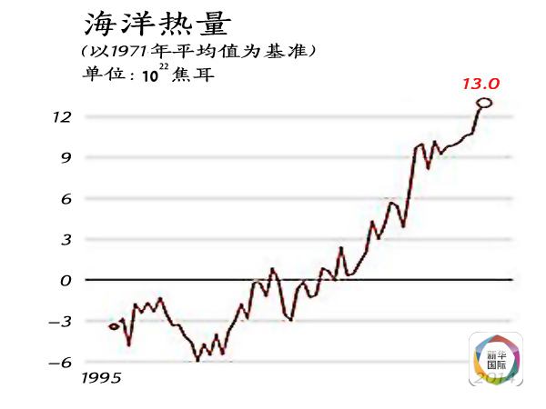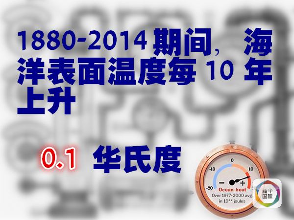 據(jù)美國獨(dú)立機(jī)構(gòu)氣候總站統(tǒng)計(jì),從1880年到2014年,海洋表面溫度每10年平均升高0.1華氏度。如果按照海洋儲(chǔ)存熱量的變化來看,以10的22次方焦耳為單位、1971年為基準(zhǔn),1955年海洋儲(chǔ)存熱量在負(fù)3個(gè)單位以下,2014年則超過13個(gè)單位。