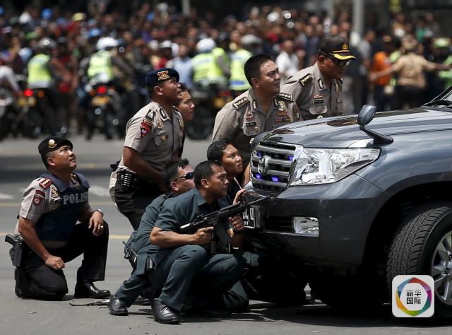 1月14日,在印度尼西亞首都雅加達(dá),警察持槍隱蔽在一輛汽車后。雅加達(dá)市中心14日上午發(fā)生多起爆炸,警方同武裝分子發(fā)生交火。新華社/路透