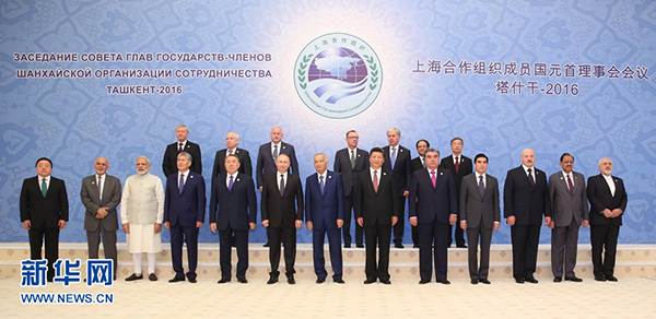 6月24日,國(guó)家主席習(xí)近平在烏茲別克斯坦塔什干出席上海合作組織成員國(guó)元首理事會(huì)第十六次會(huì)議并發(fā)表重要講話(huà)。這是大范圍會(huì)談開(kāi)始前,習(xí)近平同哈薩克斯坦總統(tǒng)納扎爾巴耶夫、吉爾吉斯斯坦總統(tǒng)阿坦巴耶夫、俄羅斯總統(tǒng)普京、塔吉克斯坦總統(tǒng)拉赫蒙、烏茲別克斯坦總統(tǒng)卡里莫夫,觀察員國(guó)阿富汗總統(tǒng)加尼、白俄羅斯總統(tǒng)盧卡申科、印度總理莫迪、蒙古國(guó)總統(tǒng)額勒貝格道爾吉、巴基斯坦總統(tǒng)侯賽因、伊朗外交部長(zhǎng)扎里夫,主席國(guó)客人土庫(kù)曼斯坦總統(tǒng)別爾德穆哈梅多夫以及有關(guān)國(guó)際和地區(qū)組織代表集體合影。新華社記者 丁林 攝