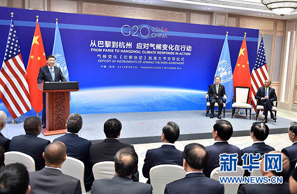 ??? 9月3日,國家主席習近平同美國總統(tǒng)奧巴馬、聯(lián)合國秘書長潘基文在杭州共同出席氣候變化《巴黎協(xié)定》批準文書交存儀式。 新華社記者李濤攝