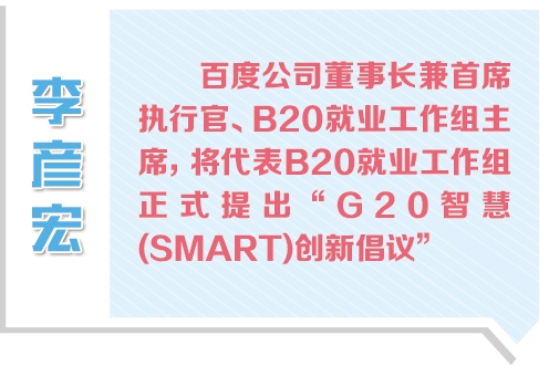 就業(yè)是B20的重點議題之一,也是當(dāng)今世界面臨的重要問題之一。如何創(chuàng)造更加充分、更高質(zhì)量的就業(yè)機會,推動實現(xiàn)經(jīng)濟的持續(xù)和平衡增長,是各國面臨的重要任務(wù)。根據(jù)G20杭州峰會的“創(chuàng)新增長方式”議題,B20就業(yè)工作組主席、百度公司董事長兼首席執(zhí)行官李彥宏代表B20就業(yè)工作組提出了“G20智慧(SMART)創(chuàng)新倡議”。這一倡議得到了二十國集團工商界、商協(xié)會、國際機構(gòu)和智庫代表的廣泛認可。