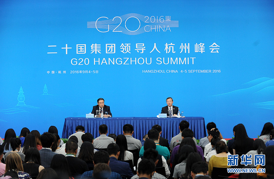 9月3日,中國(guó)代表團(tuán)在浙江杭州舉行新聞發(fā)布會(huì),商務(wù)部副部長(zhǎng)王受文就G20杭州峰會(huì)經(jīng)貿(mào)成果展望向記者介紹情況并回答提問。新華網(wǎng)記者?陳競(jìng)超 攝
