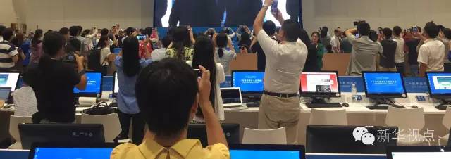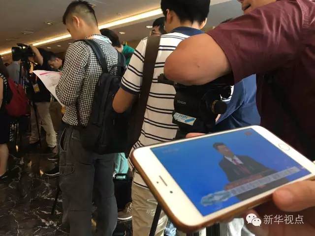 由于峰會現(xiàn)場場地有限,許多記者無法到會場實地進(jìn)行采訪報道。不愿錯過精彩瞬間的他們架起“長槍短炮”,對準(zhǔn)新聞中心內(nèi)正在直播開幕式實況的大屏幕。