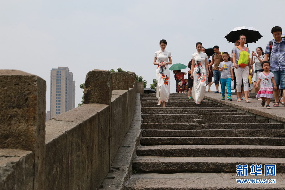 ????拱宸橋面上徐徐走來的姑娘是本次G20杭州峰會(huì)的志愿者。栩栩如生的杭州刺繡,搭配姑娘優(yōu)雅大方的儀態(tài),加之中英文雙語的精彩講解,讓中外游客印象深刻。新華網(wǎng) 翁 璟 攝