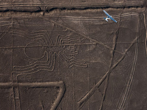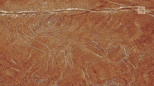 ????站在地面上的話,你幾乎看不到納斯卡線,它們由淺色泥土畫成,兩邊由深色石頭畫的線來提亮。這個(gè)地區(qū)有數(shù)量眾多的納斯卡線——長達(dá)幾千米的碎片狀的三角形和矩形,非寫實(shí)的動(dòng)物和鳥類圖案:一只猴子,一只禿鷹,一只完全對(duì)稱的蜘蛛,一只蜂鳥。