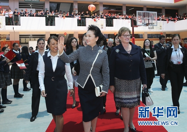 11月21日,國家主席習(xí)近平夫人彭麗媛在利馬參觀若望二十三世秘中學(xué)校。 新華社記者丁林?jǐn)z
