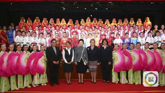 ??? 在學校禮堂,彭麗媛觀看學生文藝演出。學生們表演了合唱《歌聲與微笑》《在希望的田野上》,中秘兒童服裝表演、武術(shù)和扇子舞等。演出結(jié)束后彭麗媛與全體演員合影,感謝他們的精彩演出。